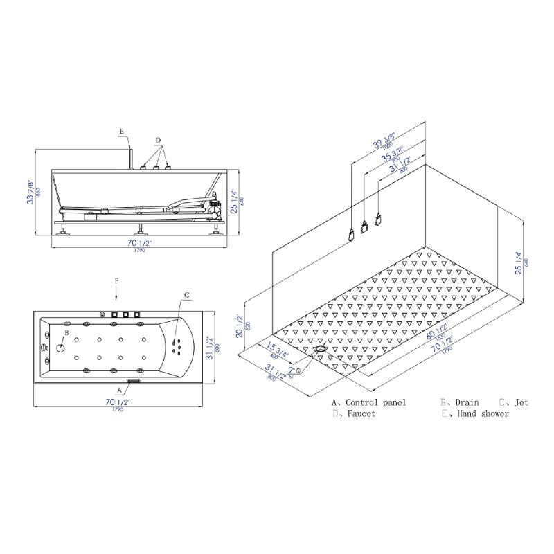 The AM154JDTSZ-70 has a left hand drain and also features an LED chromatherapy lighting system and a touch sensitive LCD control panel.