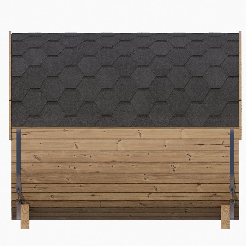 Thermo-Spruce wood which is stronger, more durable and longer lasting than cedar. It comes with a shingled roof kit, a tempered bronze glass window and door, floor drains and more.